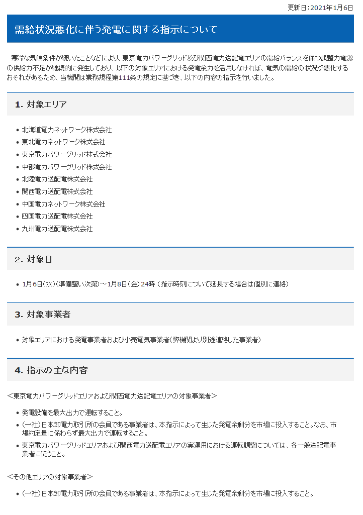 ■需給状況悪化に伴う発電に関する指示についてhttps://t.co/p1MBeOxWUL pic.twitter.com/fVz76ybK3G