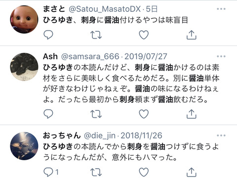 ひろゆき「刺身に醤油付ける奴は味盲。醤油の味しかしなくなるでしょw」