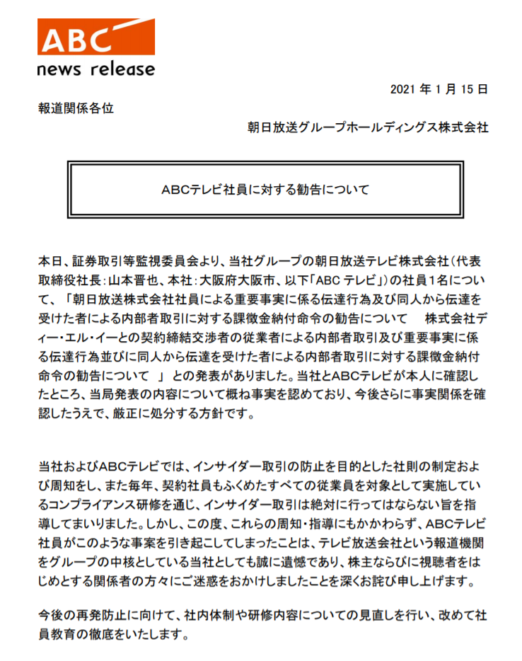 DLEの不自然な値動き、大阪・朝日放送の社員によるインサイダー取引だった