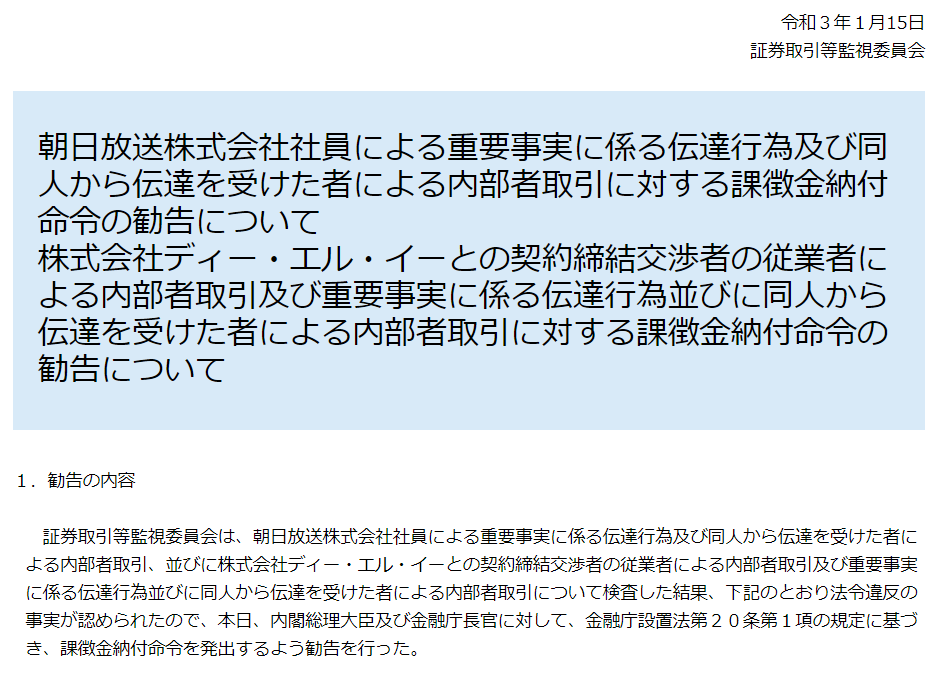 朝日放送の社員が上方修正出す直前(資料には「会社の分割を行うことについての決定をした旨の重要事実」)とDLEへ株券刷る直前の2つのネタを、知人に伝えて利確した。よりによって2社に渡るインサイダー取引。現状より厳しい処分へ変えられないものか。 pic.twitter.com/UPQirHRn5J