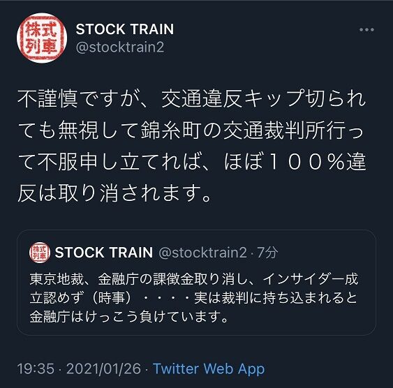 承前2)金融庁はこれ以外にも引けギャラ取引にかかわる相場操縦の課徴金命令裁判なんかも抱えてる。金儲けできるやつを気に入らんのかもしれないが、役人よりも優秀なトレーダーやポートフォリオマネージャはいるんだよ。で彼らは裁判で勝っても一切賠償されない(課徴金が取り消されるだけ)。(続