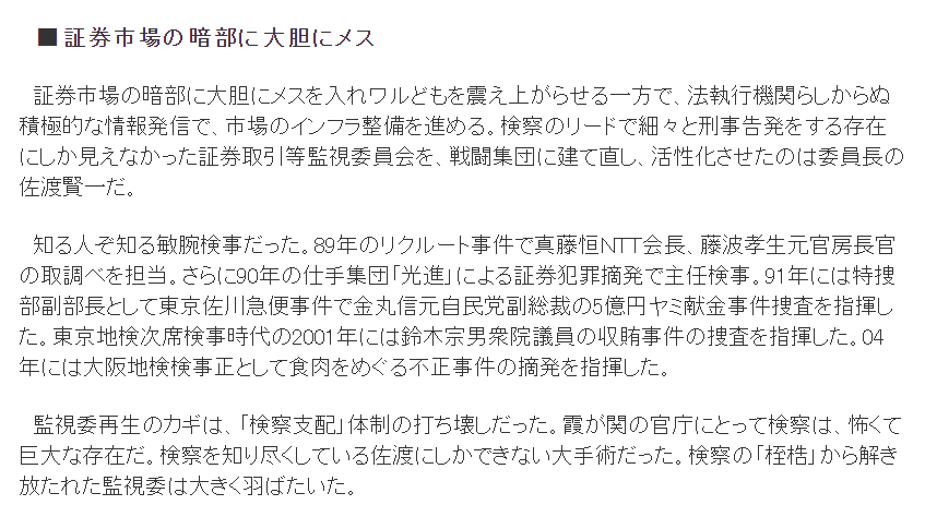 この課徴金制度を「疑わしきは罰す」ことのできる便利な制度として濫用の原因をつくったのは検察上がりの佐渡賢一・元SESC委員長だろう。下記を読めばわかるが、彼のSESC改革にあったのは検察との確執からSESCを開放することで市場との対話の観点は微塵もない。(続https://t.co/gZFUAXN6MG