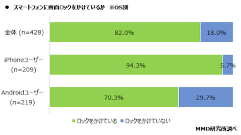 スマートフォンの画面ロックをかけている割合は、iPhoneユーザーで94.3%とほぼ全員なのに対し、Androidユーザーでは70.3%と、24.0ポイントの開きがみられます。