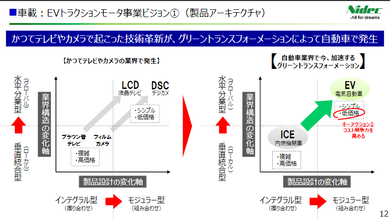 このスライドも興味深い。ガソリン車ではすり合わせ型・垂直統合型だった自動車産業が、EVになるとモジュラー型・水平分業型になることを見越しています。日本電産はEVトラクションモーターのレイヤーで大量生産・価格破壊をおこし、世界シェアを独占しに行く狙いです。永守さんの経営手腕が光ります pic.twitter.com/H4XUPxOShU