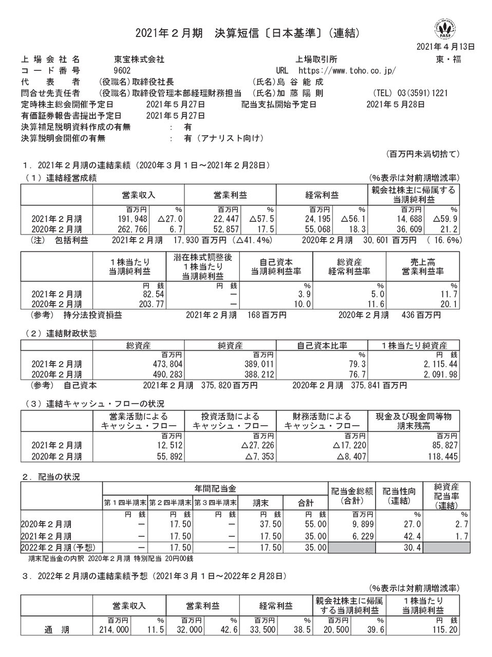 https://www.toho.co.jp/company/ir/settlement.html
