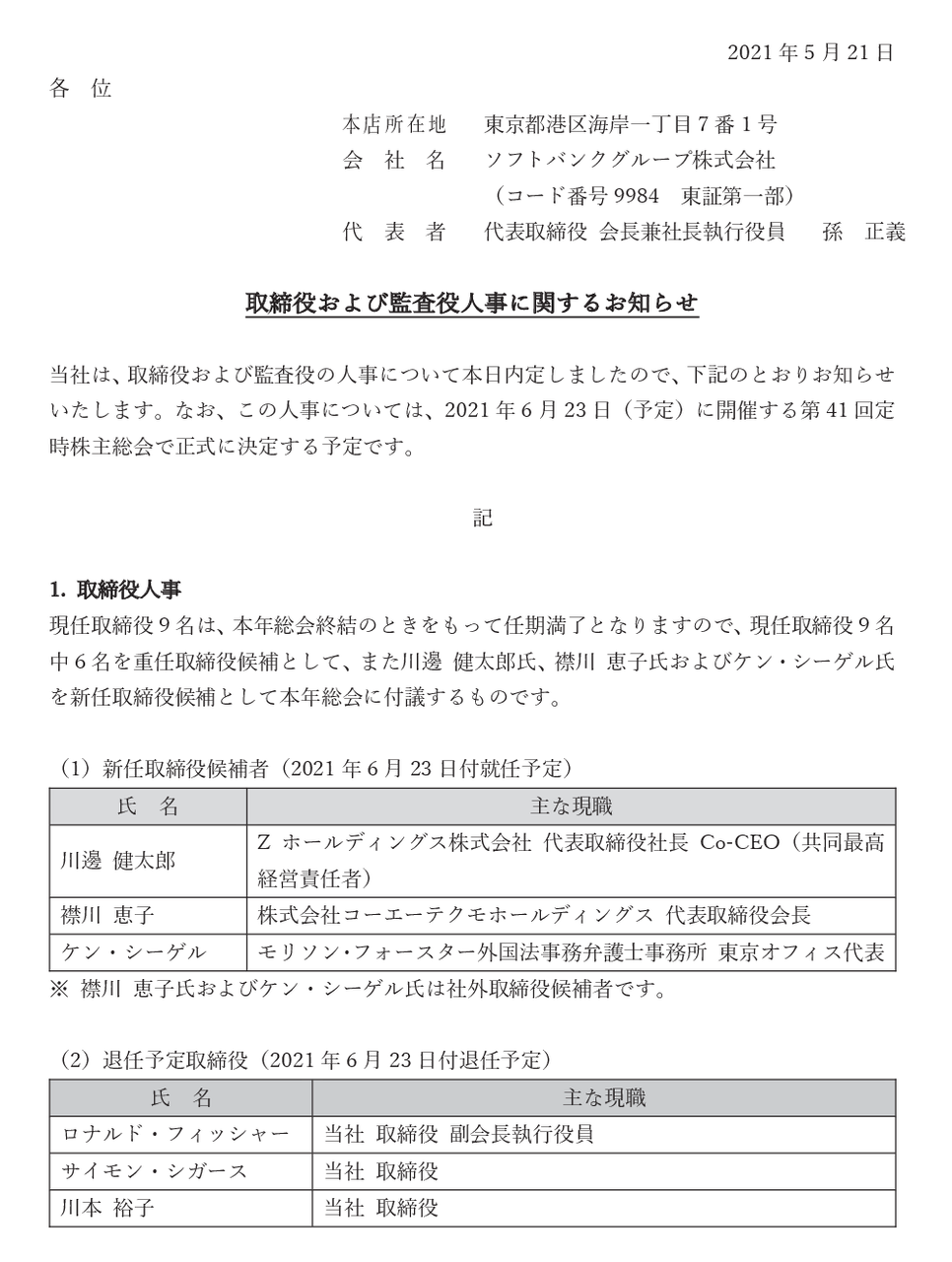 2021/05/21 ソフトバンクグループ 取締役および監査役人事に関するお知らせ