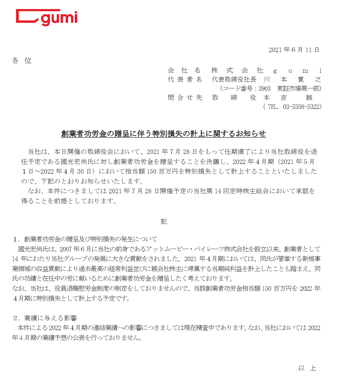 国光さん、流石に功労金貰っておいてgumi株売らんよね?