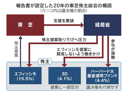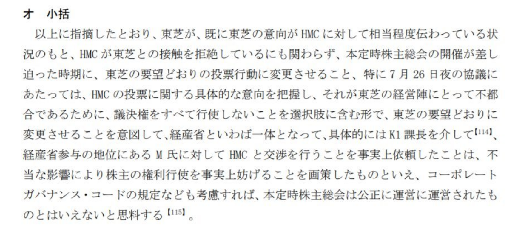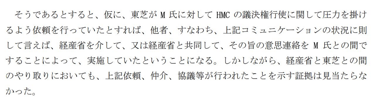 「東芝の要望どおりに変更させることを意図して、経産省といわば一体となって、具体的にはK1課長を介して、経産省参与の地位にあるM氏に対してHMCと交渉を行うことを事実上依頼したことは、不当な影響により株主の権利行使を事実上妨げることを画策した」