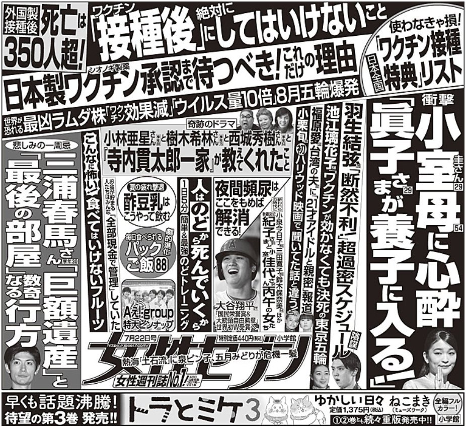 塩野義製薬、週刊女性セブンが「日本製シオノギワクチン承認まで接種は待つべき」と謎の強力バックアップ