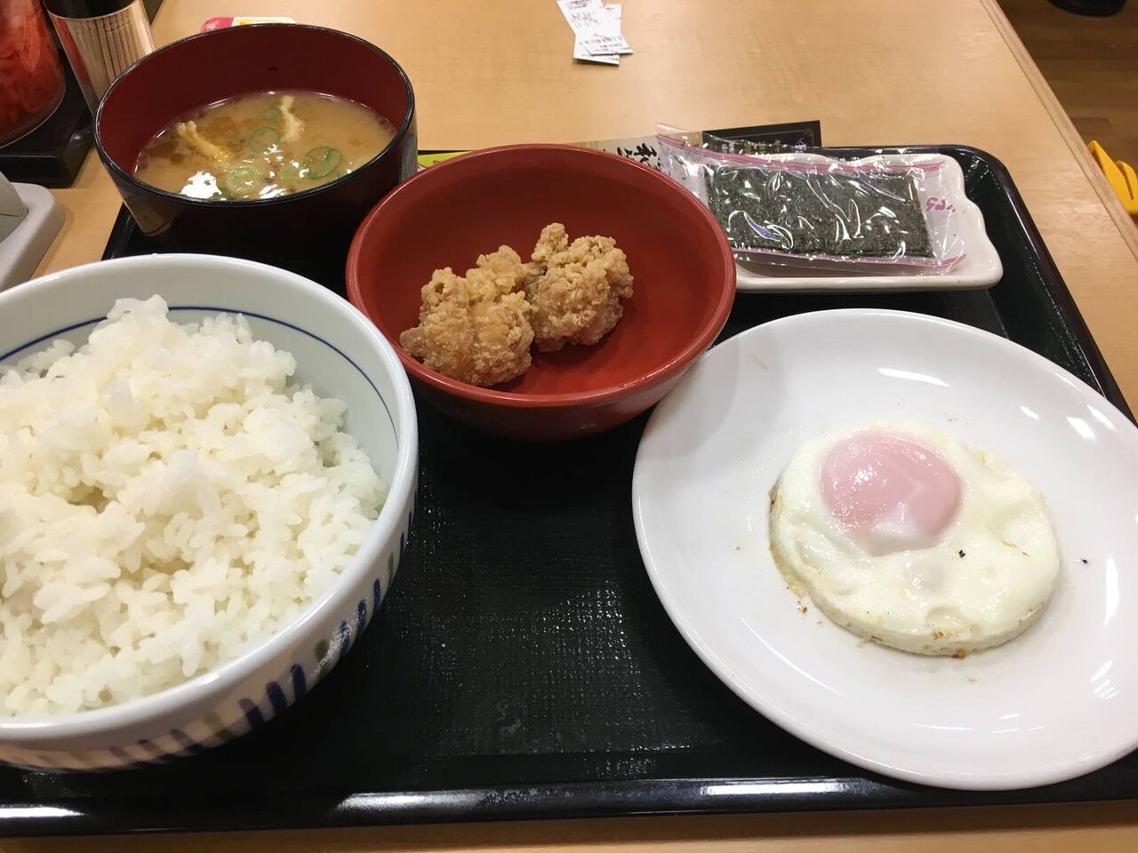 【画像】250円の朝定食に「唐揚げ(80円)」を追加すると素晴らしく豪華絢爛に…