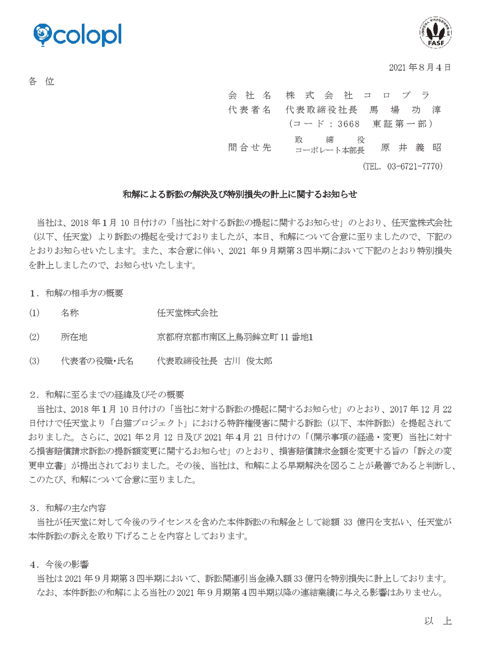 和解による訴訟の解決及び特別損失の計上に関するお知らせ
