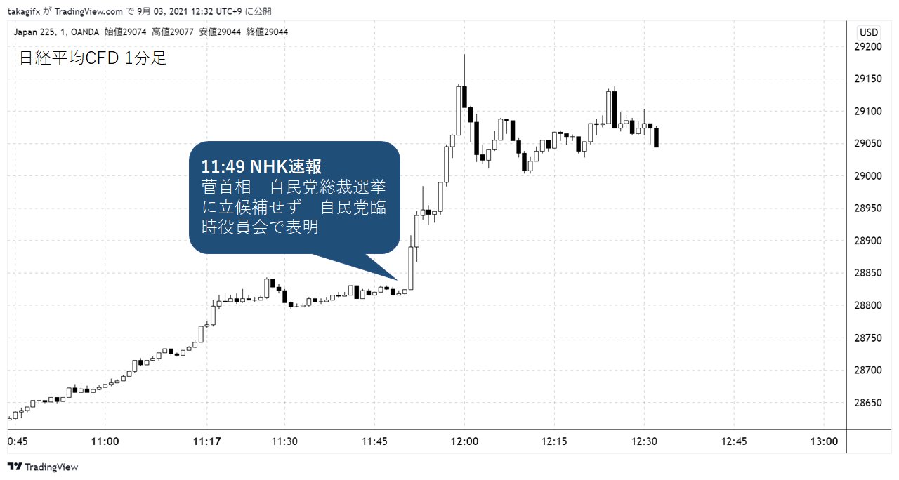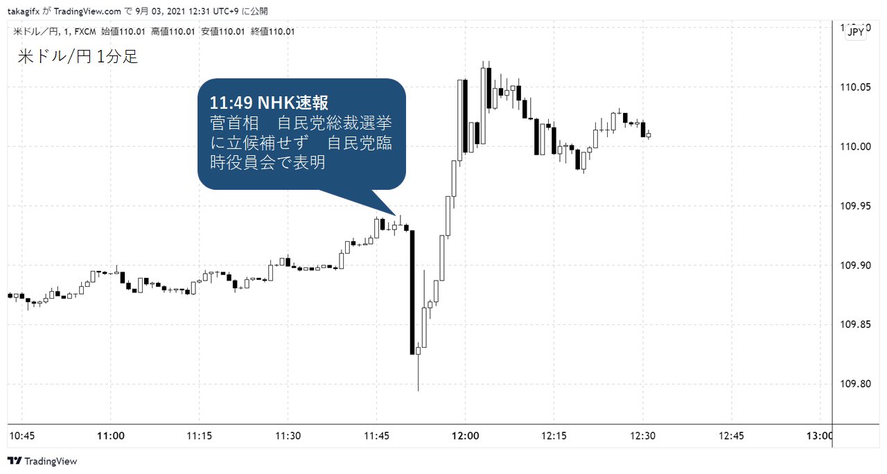 「菅総理、総裁選不出馬へ」の速報直後の1分足、日経225先物は素直に株高、ドル円は初動が円高、すぐに切り替えして円安へ pic.twitter.com/hE9PrpXIQc