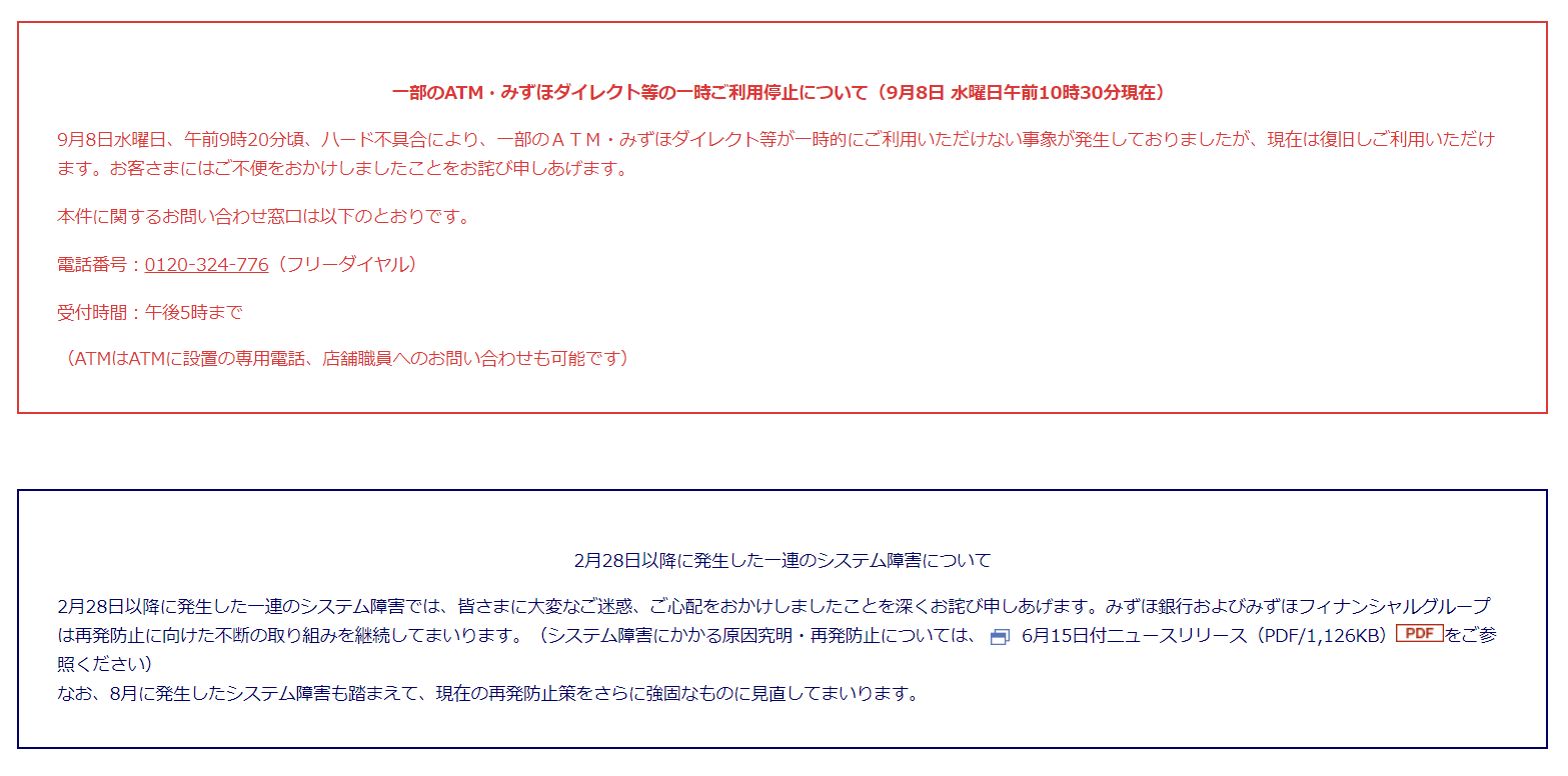 みずほ銀行で恒例のシステム障害(16日ぶり今年7回目)、今度は一部ATMとオンラインバンキングが停止する不具合