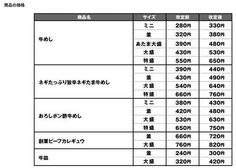 それに伴い、牛めし関連商品を全国統一価格に変更させていただくことになりました。