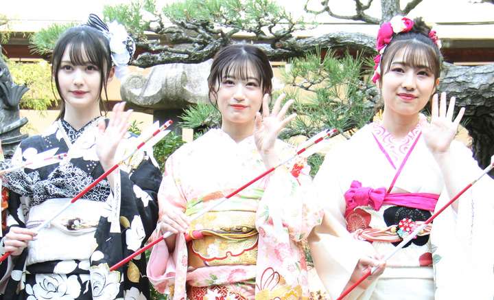 NMB48:上西怜、安部若菜、山本望叶ら新成人9人が地元・大阪天満宮で振り袖姿 「大人の階段を一つ上りました」