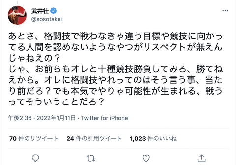 じゃ、お前らもオレと十種競技勝負してみろ、勝てねえから。オレに格闘技やれってのはそう言う事、当たり前だろ?でも本気でやりゃ可能性が生まれる、戦うってそういうことだろ?— 武井壮 (@sosotakei) January 11, 2022