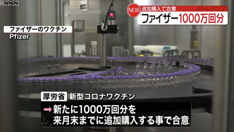 厚労省は、すでに1億2000万回分の新型コロナワクチンを購入する契約をファイザー社と締結していましたが、これに加えて1000万回分を来月までに追加購入することで合意したと発表しました。