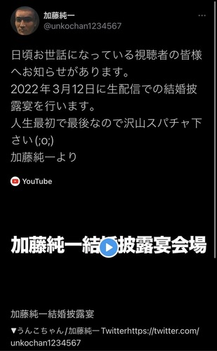 加藤純一より 。https://t.co/7vGe9KgOY7— 加藤純一 (@unkochan1234567) February 27, 2022