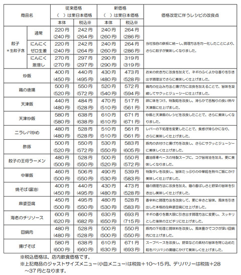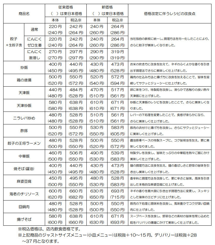 約8割の商品については店頭価格の変更はしない。対象店舗は全国の「餃子の王将」「GYOZA OHSHO」。