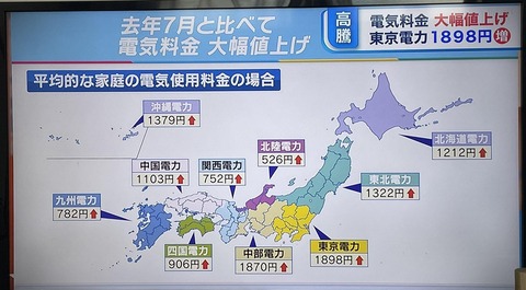 【画像あり】東京愛知の電気代、逝く。九州と近畿は余裕な模様wwwwwww