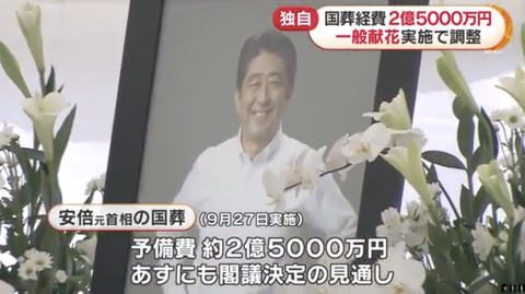国葬経費、2億5000万円を閣議決定する見通し。一般献花実施で調整