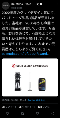 2022年度のグッドデザイン賞にて、バルミューダ製品3製品が受賞しました。当社は、2005年から今回で通算21製品が受賞しています。今後も、製品を通じて、心躍るような素晴らしい体験をお届けしていきたいと考えております。これまでの受賞歴はこちらよりご覧ください。