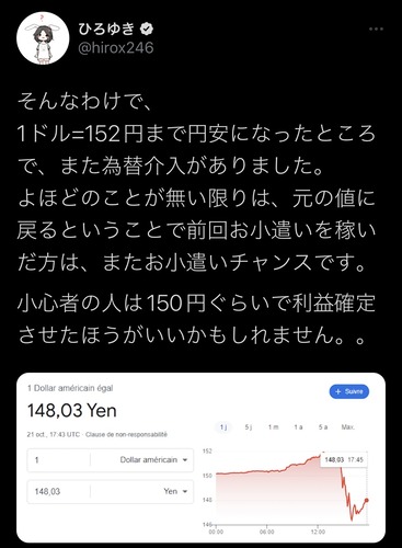 【悲報】ひろゆき「ドル円は152円まであがる!」→147円まで下落