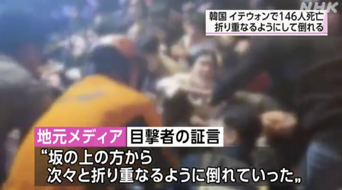 関連:ソウル転倒事故 149人死亡76人けが ハロウィーン前でにぎわう | NHK