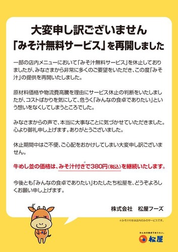 【朗報】松屋、無料みそ汁再開