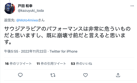 【悲報】戸田和幸さん「サウジは崩壊寸前」←結果wwwww