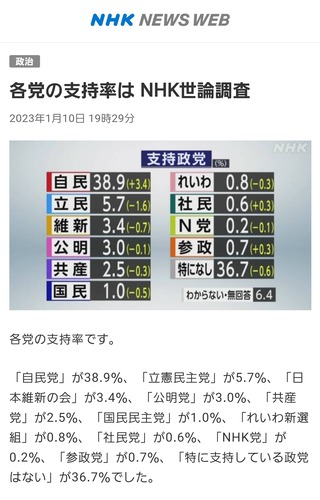 NHK世論調査、自民党支持率38.9%(+3.4)
