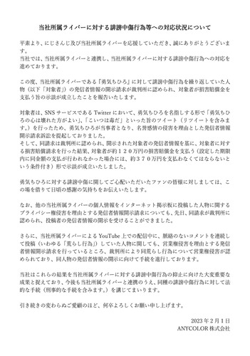 対象者が損害賠償金を支払う旨の示談が成立したことを報告いたします。 https://t.co/3rcnWGWnnW pic.twitter.com/zxMIqf9ioK— ANYCOLOR株式会社 (@ANYCOLOR_Inc) February 1, 2023