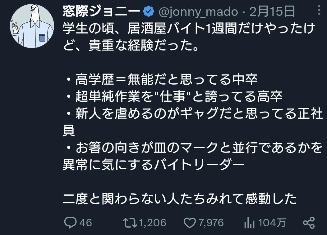 【悲報】高学歴男性「居酒屋のバイトで虐められた。底辺を見れて安心しました」←7万いいね