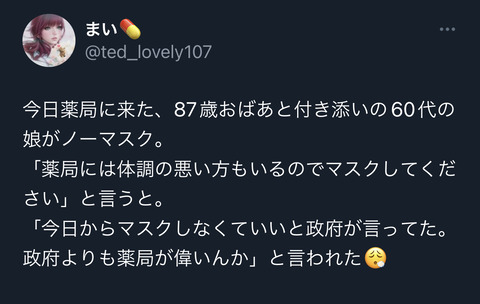 「今日からマスクしなくていいと政府が言ってた。政府よりも薬局が偉いんか」と言われた😮💨