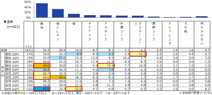 また、50代男性では「マヨネーズ」が15.4%、20代男性は「ウスターソース」(13.3%)が他の性別や年代に比べて高かったそうです。