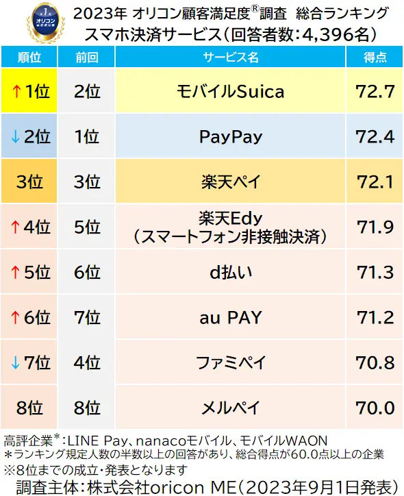 スマホ決済満足度で「モバイルSuica」がPayPay上回り1位に オリコン調査