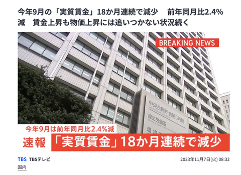 今年9月の「実質賃金」18か月連続で減少 前年同月比2.4%減 賃金上昇も物価上昇には追いつかない状況続く | TBS NEWS DIG