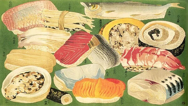 江戸時代の鮨の浮世絵はいくつか残っているが(例えば広重のものなど)、江戸を代表する寿司屋が自ら描かせた、『四代目主人の縁者が、明治十年頃の実際に「與兵衛ずし」で売られていた鮨を20種類のメニューの中から15種類をピックアップして、日本画家の「川端玉章」に写生させたという「絵」』(sushitimes)、が資料性が高いだろう。