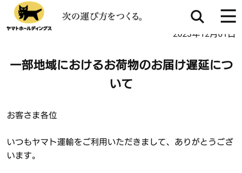 【悲報】ヤマト運輸さん限界突破。荷物量増加により一部地域で配送遅延発生中。年末に向けて遅延が拡大も