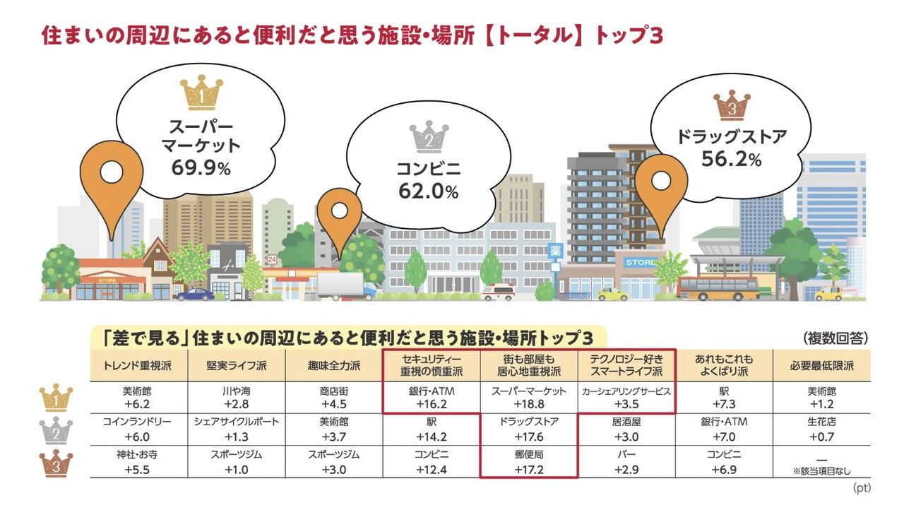 一人暮らしで、近くにあると便利な施設 3位「ドラッグストア」、2位「コンビニ」、1位は?
