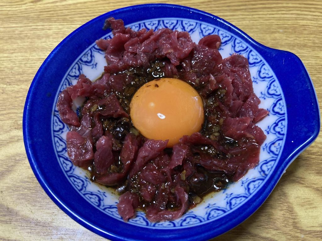 (´・ω・`)業務スーパーで298円の馬肉買ってきてユッケ作ったから見て