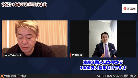 「【堀江貴文 × 竹中平蔵】このままいくと2030年代の日本は本当にやばい…!? 」といったタイトルで投稿された動画。そこで竹中氏は「2030年代に何が起こるかって考えると、その10年間で生産年齢人口が今から1000万人減るわけですよ」と切り込む。