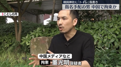 董容疑者は今年5月、東京・千代田区の靖国神社の石柱に赤いスプレーで、英語で「トイレ」と落書きをし、損壊した疑いなどで警視庁に指名手配されています。