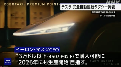 マスクCEOによりますと、価格は3万ドル以下、日本円にして450万円以下で購入できるようにするとして、2026年にも生産開始を目指すということです。
