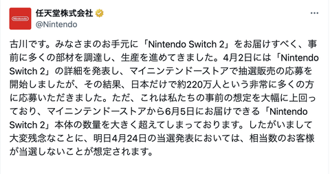 【悲報】Switch2の初回抽選、大量落選か「相当数のお客様が当選しないことが想定されます」