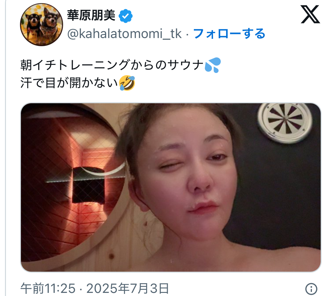 「朝イチトレーニングからのサウナ」とサウナルームの外での自撮り姿をXで披露。「汗で目が開かない」とウィンクしたような表情で笑顔を浮かべている。コンサート後もトレーニングを欠かさず行っているようだ。