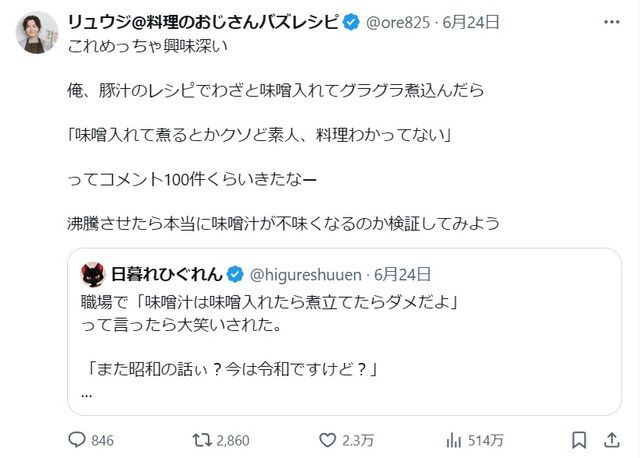 料理研究家のリュウジさんも「味噌入れてから沸騰させて味が変わるか検証する」って引用投稿しておられたのですが、私の職場のケースでは煮詰まるほど沸騰させてしまうから、ちょっと話が違うんです。