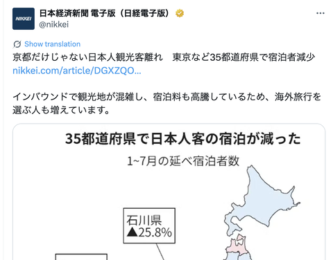京都だけじゃない日本人観光客離れ 東京など35都道府県で宿泊者減少https://t.co/913VNxRleN
