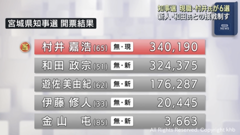宮城県知事選挙、村井嘉浩氏が和田政宗氏との接戦を制し6回目の当選を決める