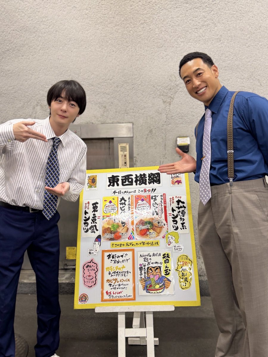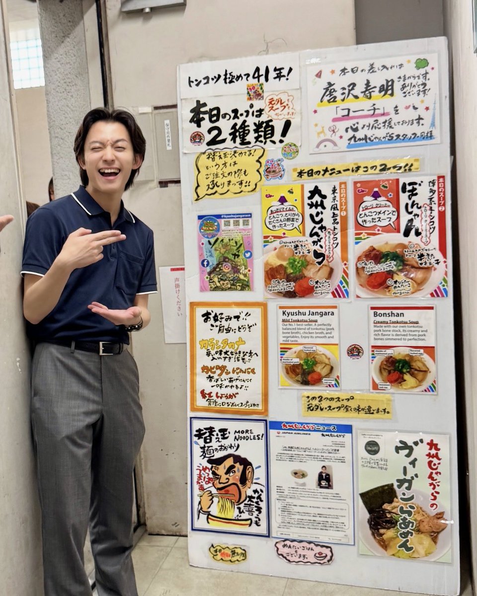 添えられた写真には、撮影現場に出現したラーメン店のメニューを前に、共演者の犬飼貴丈や関口メンディー、阿久津仁愛の歓喜の笑顔が。とくに犬飼はラーメン好きを公言しており、カメラを前にラーメンを食べるポーズで喜びを表現している。